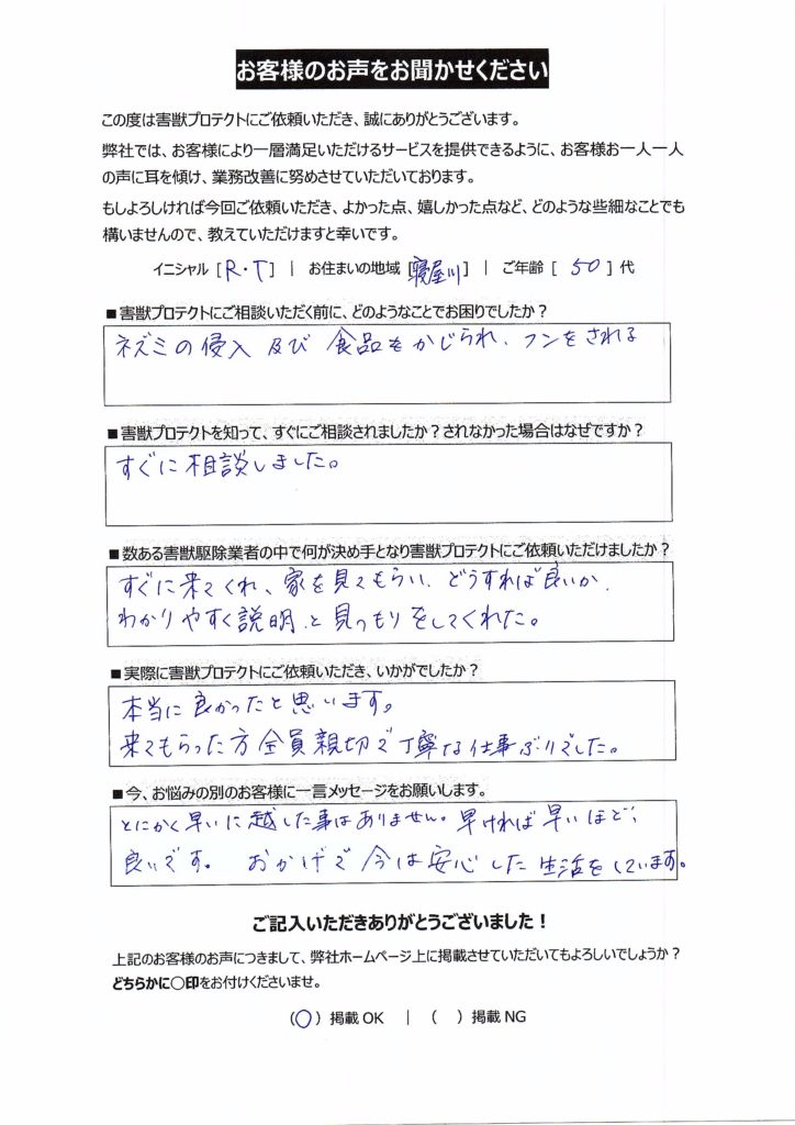 そこで、私たちは「害獣駆除」の文言が入っていない目立たない車でご訪問したり、作業服も「いかにも害獣駆除業者」という感じではなく、デニムで清潔感がある服装でお伺いさせていただいています。